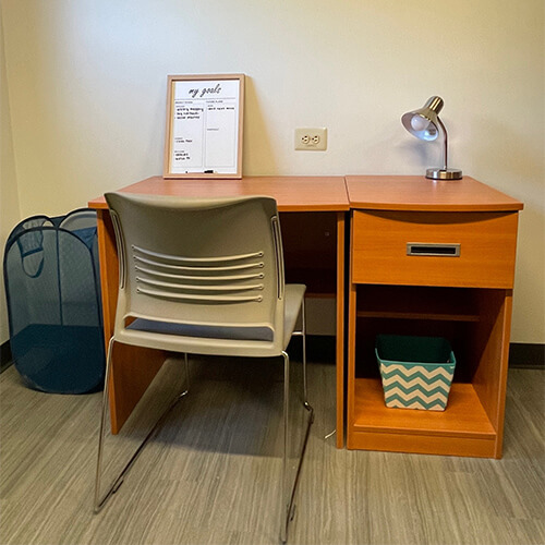 1 bed, desk, chair, wardrobe, and dresser per resident |